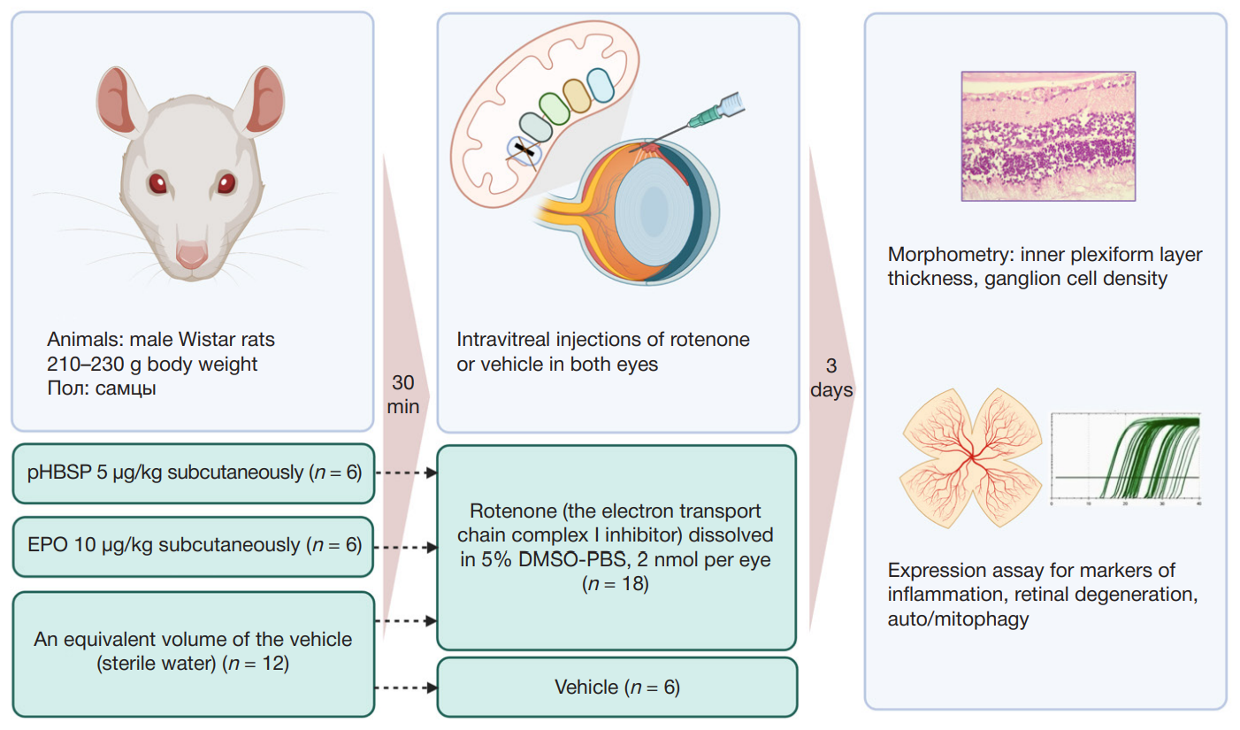Author contribution: Soldatov VO — concept and design of the study, writing of the manuscript; Pokrovsky MV, Lapin KN — consulting on the concept and design of the study; Puchenkova OA — collection of samples for histological examination and target gene expression analysis; Puchenkova OA, Zhunusov NS — modeling of the rotenone-induced retinal degeneration; Zhunusov NS, Krayushkina AM — in vitro assay of rotenone cytoprotective activity; Grechina AV — morphological study; Bushueva OYu, Soldatova MO — RNA extraction, quantitative PCR assay.