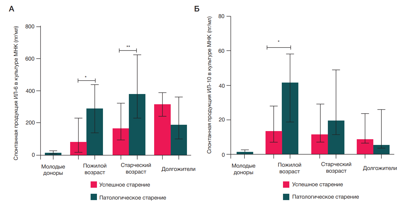 Рис. 1. Спонтанная продукция ИЛ-6 (А) и ИЛ-10 (Б) в культуре МНК периферической крови лиц пожилого, старческого возраста и долгожителей при различных фенотипах старения. Данные представлены в виде медианы (Me) и интерквартильных размахов (Interquartile range), статистически значимые различия между фенотипами старения внутри исследуемых возрастных групп: * — p < 0,05; * * — p < 0,01