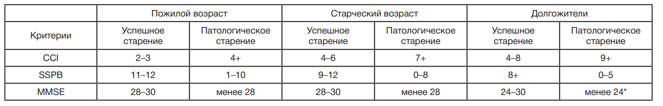 Таблица. Критерии разделения исследуемых групп на подгруппы успешного и патологического старения