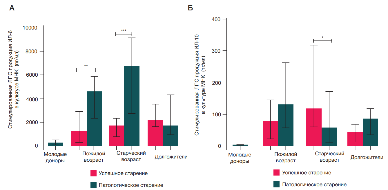 Рис. 2. ЛПС-индуцированная продукция ИЛ-6 (А) и ИЛ-10 (Б) в культуре МНК периферической крови лиц пожилого, старческого возраста и долгожителей при различных фенотипах старения. Данные представлены в виде медианы (Me) и интерквартильных размахов (Interquartile range), статистически значимые различия между фенотипами старения внутри исследуемых возрастных групп: * — p < 0,05; * * — p < 0,01, * * * — p < 0,001