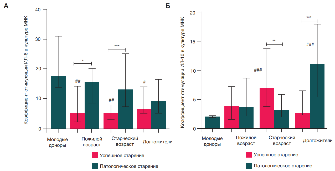 Рис. 3. Коэффициенты стимуляции продукции ИЛ-6 (А) и ИЛ-10 (Б) в культуре МНК периферической крови лиц пожилого, старческого возраста и долгожителей при различных фенотипах старения. Данные представлены в виде медианы (Me) и интерквартильных размахов (Interquartile range), статистически значимые различия между фенотипами старения: * — p < 0,05; * * — p < 0,01; * * * — p < 0,001; статистически значимые различия по отношению к группе сравнения (молодые доноры): # — p < 0,05; ## — p < 0,01; ### — p < 0,001