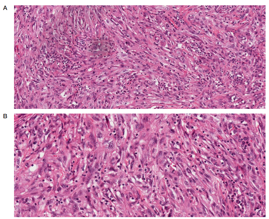 Fig. 2. Spindle cell variant of anaplastic thyroid carcinoma (ATC). A. Dense, multidirectional bundles of spindle cells with the pronounced nuclear pleiomorphism, coarsely granular chromatin (H&E, ×100 magnification). B. High cellularuty, multiple atypical mitoses, sporadic multinucleated tumor cells (H&E, ×400 magnification)