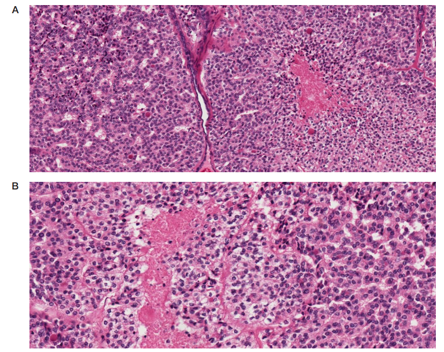 Fig. 3. Differentiated high-grade thyroid carcinoma (DHGTC). A. Solid/trabecular and alveolar areas with the zone of comedo/geographical necrosis (H&E, ×100 magnification). B. Pronounced increase in cytological atypia and proliferation; frequent mitoses (≥ 5 per 2 mm2 when counted in the fields with the highest activity) (H&E, ×400 magnification)