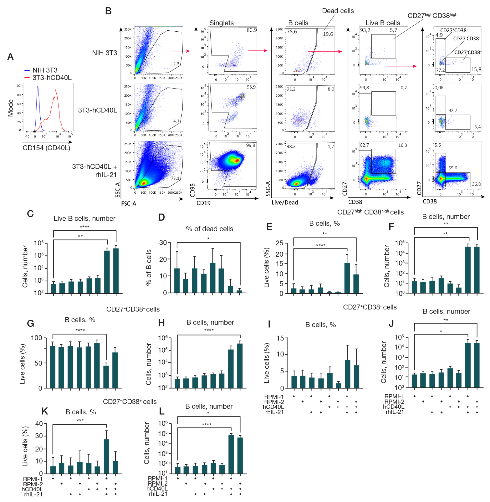 Fig. 1. Analysis of effect of a feeder line expressing rhCD40L, cytokine IL-21, and culture medium composition on the growth of B cell culture. The feeder line 3T3-hCD40L was obtained by transfecting the NIH 3T3 mouse fibroblast line with the pcDNA3.1-hCD40L plasmid to obtain a cell line stably expressing the transgene and subsequent selection of a monoclone with the highest level of hCD40L. 1.5 × 104 (CD19+ CD20+) B cells obtained as a result of fluorescence sorting from human peripheral blood PBMCs were cultured on the feeder line 3T3-hCD40L with/without the addition of rhIL-21 (50 ng/ml) in two different culture media compositions (RPMI-1 and RPMI-2) for 7 days. Comparison was performed relative to B cells cultured in the presence of the untransfected NIH 3T3 feeder line. B cell cultures were analyzed by flow cytometry. A. Histogram of the distribution of the hCD40L (CD154) expression level on the surface of 3T3-hCD40L feeder cells (marked with a red line) compared with control untransfected NIH 3T3 fibroblasts (marked with a blue line). B. Representative graphs of the cytometric analysis. The gating strategy is indicated by arrows. C, D. The number of live B cells (C) and the percentage of dead B cells (D) in the cultures. E–L. Quantitative analysis of the percentage of live B cells and the total number of live B cells phenotypically divided by surface expression of CD27 and CD38 into CD27high CD38high — plasma cells and plasmablasts (E, F), CD27–CD38– (G, H), CD27+CD38– (I, J), and CD27–CD38+- B cells (K, L). The data is presented as the mean ± standard deviation (SD) for four independent experiments (n = 4), each experiment was performed in duplicate. Statistical analysis was performed by one-way analysis of variance (ANOVA) with Dunnett's correction for multiple comparisons, *, * *, * * *, * * * * — p ≤ 0.05; 0.001; 0.0001; 0.0001, respectively