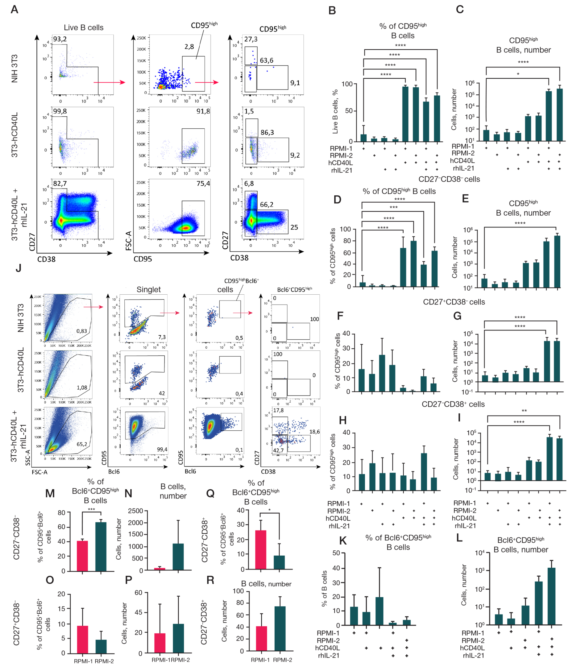 Fig. 2. Analysis of the effect of CD40L, IL-21, and cell culture medium composition on the surface expression of CD95 and intracellular expression of the transcription factor BCL6 in B-cell cultures. A–I. Analysis of the surface expression of CD95 and co-expression of CD27 and CD38 on B cells in cultures (excluding CD27high CD38high — plasma cells). Representative graphs of flow cytometry analysis. The gating strategy is indicated by arrows (A). Quantitative analysis of the percentage of (B) and absolute number (C) of CD95high -B cells in cultures. Quantitative analysis of the percentage of B cells and the absolute number of live CD95high -B cells for CD27–CD38– (D, E), CD27+CD38– (F, G), and CD27–CD38+ (H, I) B cells. J–R. B cells cultured in the presence of NIH 3T3 feeder line expressing hCD40L with or without rhIL-21 (50 ng/ml) in RPMI-1 or RPMI-2 were fixed and permeabilized for staining of the intracellular transcription factor BCL6. Comparison was made relative to B cells cultured in the presence of the untransfected NIH 3T3 line. Representative graphs of flow cytometry analysis of fixed B cells from the cultures. The gating strategy is indicated by arrows (J). Quantitative analysis of the BCL6+CD95high -B cells percentage (K) and absolute number (L) of the total number of B cells. Quantitative analysis of the percentage and absolute number of CD27–CD38– (M, N), CD27+CD38– (O, P) and CD27–CD38+ (Q, R) BCL6+CD95high B cells. The graphs present the data as the mean ± standard deviation (SD) for four independent experiments (n = 4), each experiment was performed in duplicate. Statistical analysis of CD95high B cell (B–I) and BCL6+CD95high B cell (K, L) subpopulations was performed by one-way analysis of variance (ANOVA) with Dunnett’s correction for multiple comparisons. Statistical analysis of BCL6+CD95high B cell (M–R) subpopulations was performed by unpaired T-test. *, * *, * * *, * * * * — p ≤ 0.05; 0.001; 0.0001; 0.0001 respectively