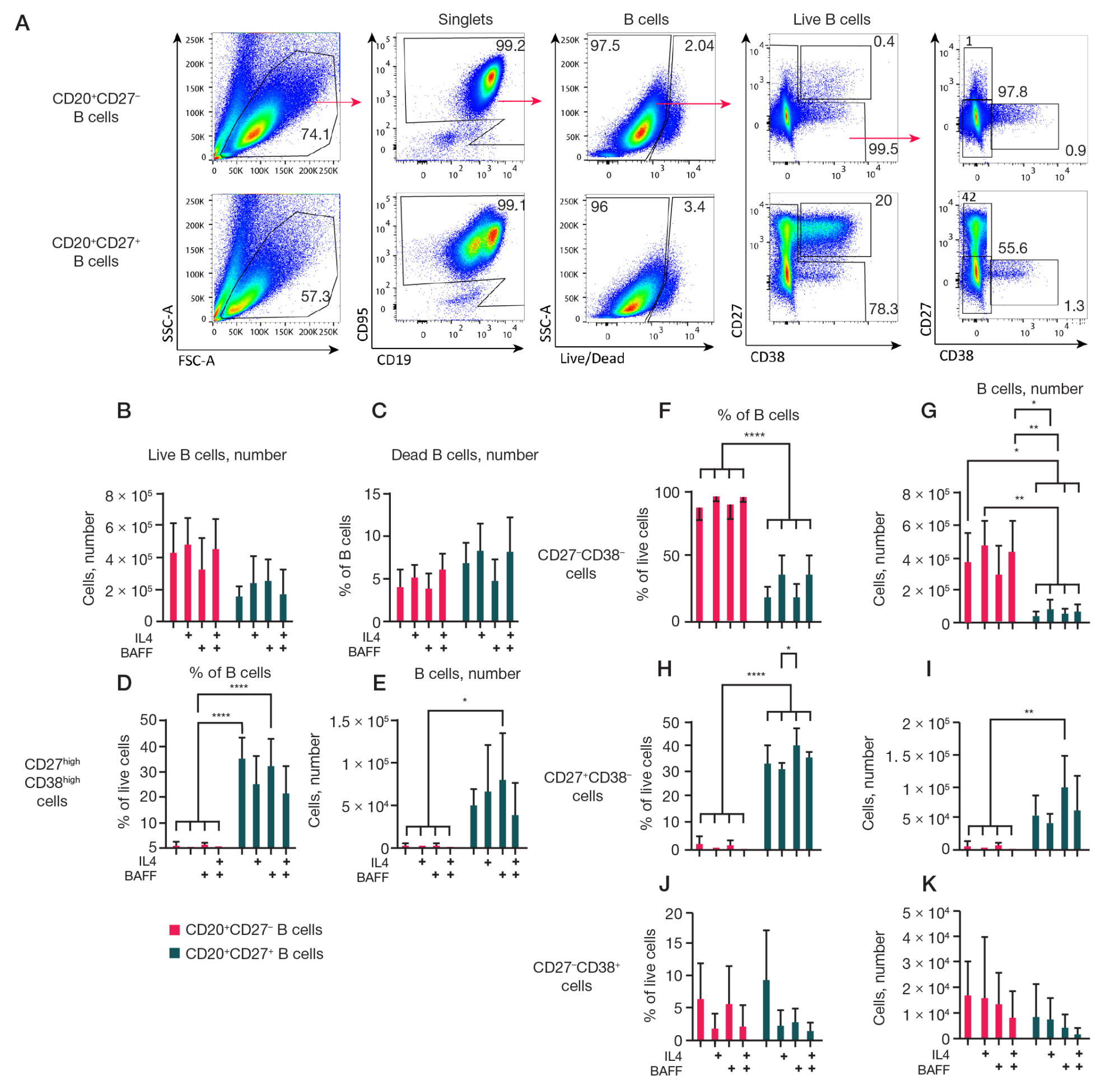 Fig. 3. Analysis of the effect of different cytokine compositions on CD27– and CD27+ memory B cell cultures. Predominantly naive B cells (CD19+CD20+CD27–) and memory B cells (CD19+CD20+CD27–) obtained from blood PBMC by FACS, at a concentration of 1.5 × 104 were cultured on 3T3 feeder cells expressing hCD40L in RPMI-2 culture medium in the presence of rhIL-21 (50 ng/ml), with or without the addition of rhIL-4 (10 ng/ml) and rhBAFF (100 ng/ml) cytokines for 7 days. Cell cultures were analyzed by flow cytometry. A. Representative graphs of flow cytometry analysis. Arrows indicate the gating strategy. The number of live B cells (B) and the percentage of dead B cells (C) in cultures. Quantitative analysis of the percentage of live B cells and the absolute number of CD27highCD38high — plasma cells and plasmablasts (D, E), CD27–CD38– (F, G), CD27+CD38– (H, I), and CD27–CD38+ (J, K) B cells. The graphs present the data as the mean ± standard deviation (SD) for four independent experiments (n = 4), each experiment was performed in duplicate. Statistical analysis was performed by two-way analysis of variance (ANOVA) with Tukey's test for multiple comparisons, *, * *, * * *, * * * * — p ≤ 0.05; 0.001; 0.0001; 0.0001, respectively