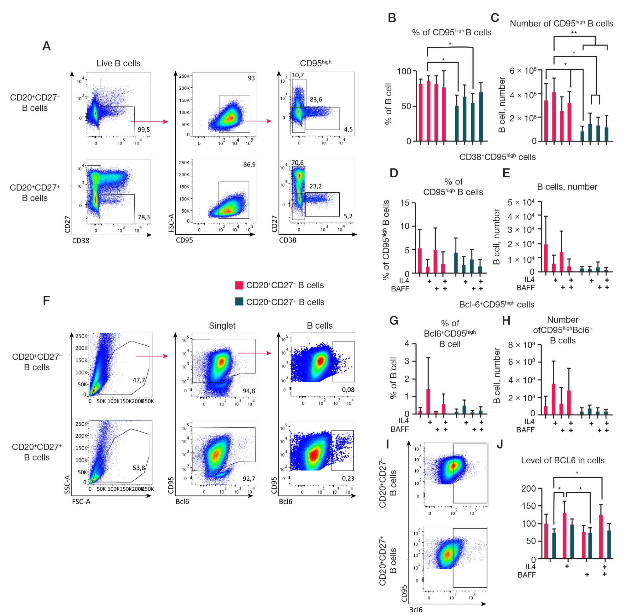 Fig. 4. Analysis of the effect of different cytokine compositions on the surface expression of CD95 and intracellular expression of the transcription factor BCL6 on cultures of CD27– B cells and CD27+ memory B cells. 1.5 × 104 CD19+CD20+CD27– and CD19+CD20+CD27– B cells were cultured on 3T3 feeder cells expressing hCD40L in RPMI-2 culture medium in the presence of rhIL-21 (50 ng/ml), with or without the addition of the cytokines rhIL-4 (10 ng/ml) and rhBAFF (100 ng/ml) for 7 days. A–E. Analysis of CD95 surface expression and CD27 and CD38 co-expression on B cells in cultures (excluding CD27high CD38high plasma cells). Representative graphs of flow cytometry analysis of CD95 surface expression. The gating strategy is indicated by arrows (A). Quantitative analysis of the percentage of live B cells (B) and the absolute number (C) of live CD95high B cells in cultures. Quantitative analysis of the percentage of CD95high B cells (D) and the absolute number of live CD38+CD95high B cells (E). F–J. Analysis of intracellular BCL6 expression in cell cultures. For this, cells from the cultures were fixed and permeabilized for staining of the intracellular transcription factor BCL6. Representative graphs of flow cytometry analysis (F). The gating strategy is indicated by arrows. Percentage (G) of B cells and absolute number (H) of CD95high BCL6+ cells. Representative panels of cytometric analysis illustrating the distribution of BCL6 in cell cultures of CD20+CD27+ and CD20+CD27– B cells (I). Mean fluorescence intensity (MFI) of the transcription factor BCL6 in cells from cultures (J). Quantitative analysis data are presented as the mean ± standard deviation (SD) for four independent experiments (n = 4), each experiment was performed in duplicate. Statistical analysis was performed by two-way analysis of variance (ANOVA) using Tukey's multiple comparison test, *, * *, * * *, * * * * — p ≤ 0.05; 0.001; 0.0001; 0.0001, respectively
