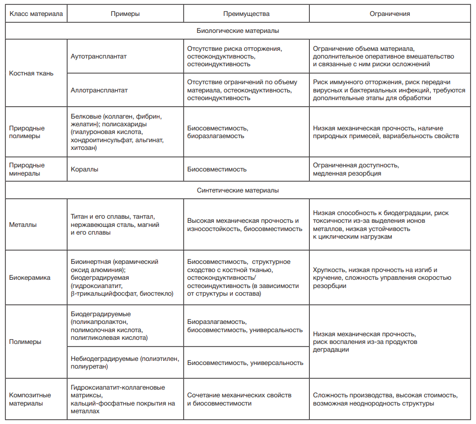 Таблица 1. Сравнительный анализ основных классов материалов для костной пластики [3–11]