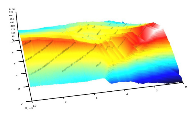 Рис. 3. АСМ-изображение рельефа поверхности B4C-керамики, изготовленной методом свободного спекания. Размер поля 10 × 10 мкм. Масштаб по оси Z: 0–0,74 мкм