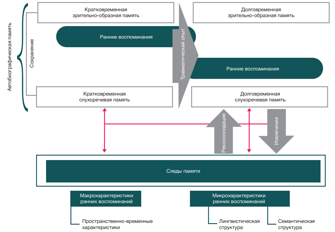 Рис. 1. Схема концептуальной модели исследования реконсолидации ранних воспоминаний в переживаниях травматического опыта участия в боевых действиях