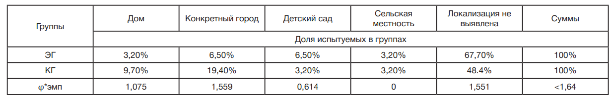 Таблица 1. Показатели сравнительного анализа показателей типа локализации ранних воспоминаний в экспериментальной и контрольной группах