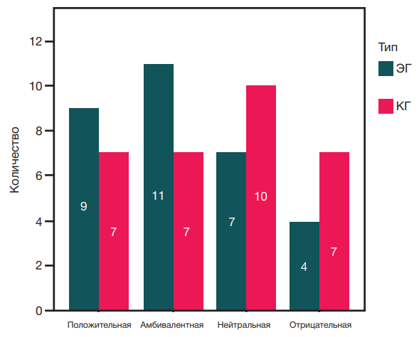Рис. 4. Гистограмма частот распределения модальностей ранних воспоминаний в экспериментальной и контрольной группах