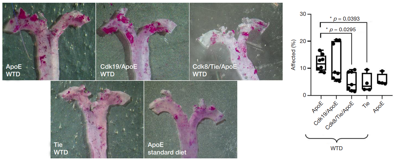 Fig. 3. Aorta assessment in mice of experimental groups ApoE WTD, Cdk19/ApoE WTD, Cdk8/Tie/ApoE WTD, Tie WTD, as well as ApoE fed with standard feed. Representative image of the studied aortas (on the left), diagram of the affected area calculation (on the right). The aortic lesions are marked with white dotted lines (*— p < 0.05)