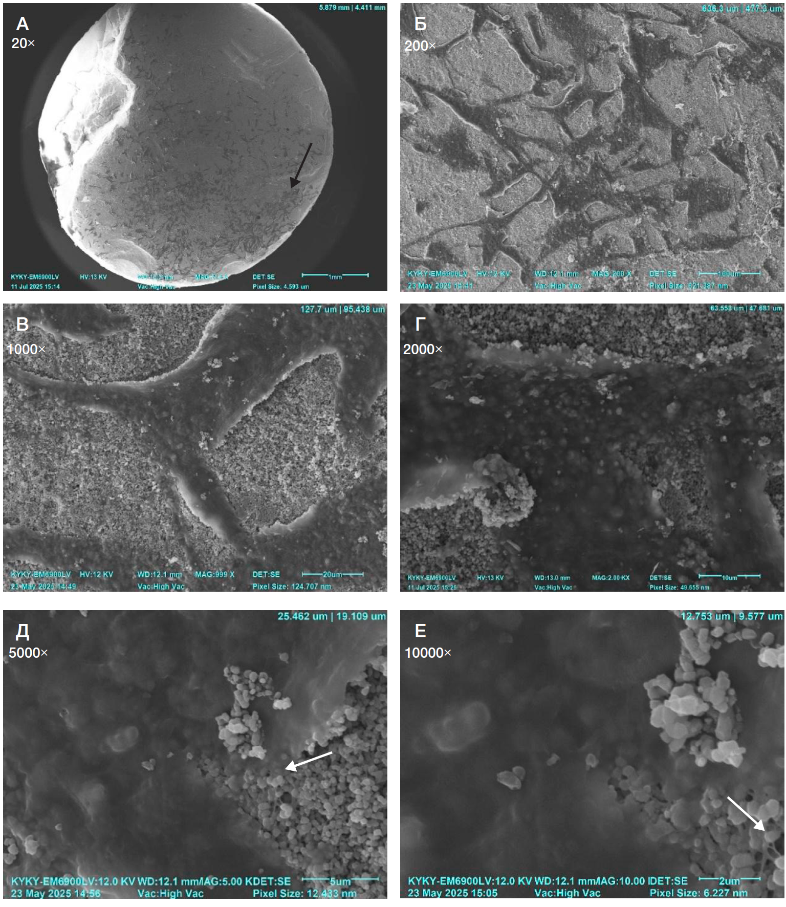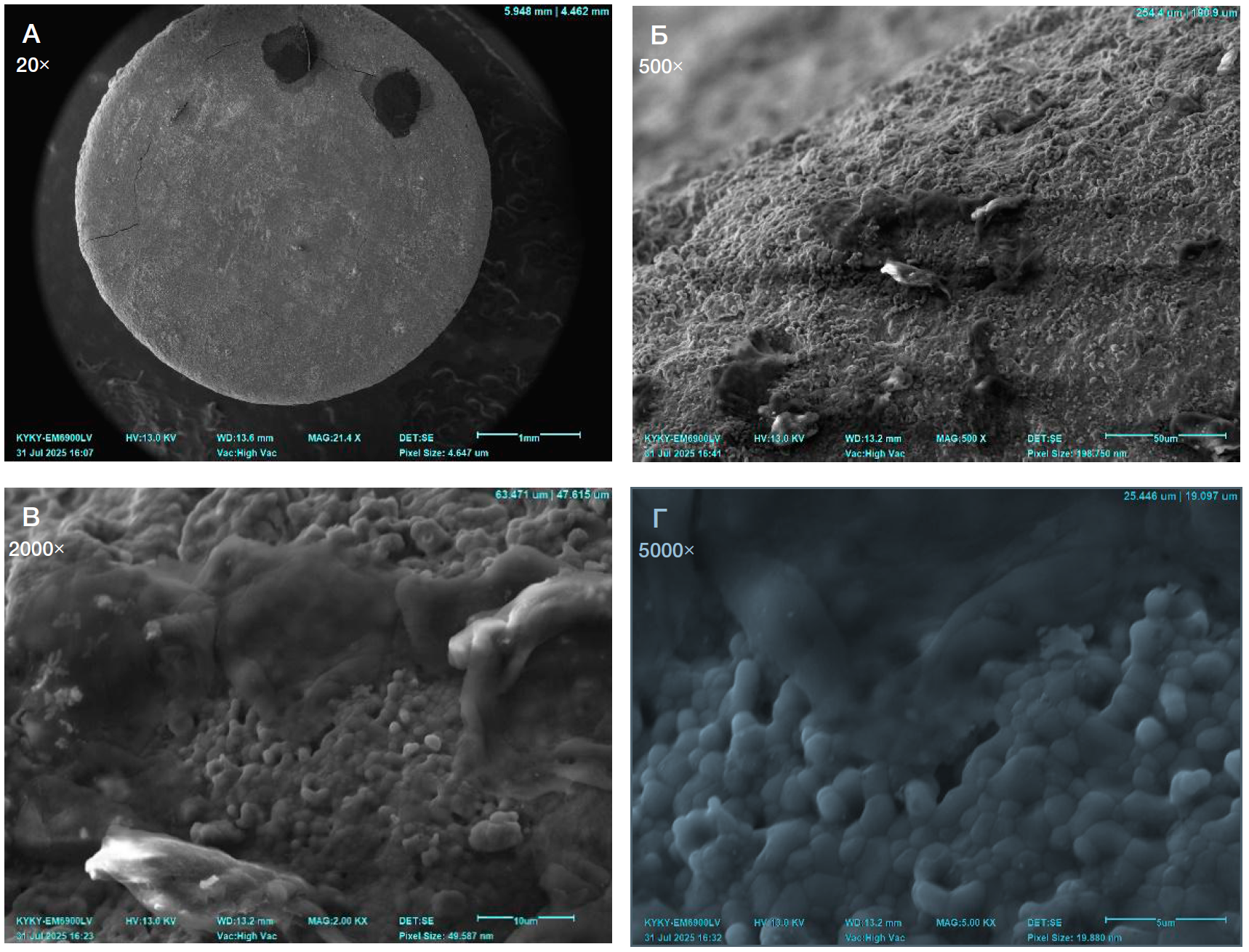 Рис. 2. Сканограммы поверхности образцов гидроксиапатита после спекания при 1250 °С с растущими мезенхимальными стволовыми клетками из жировой ткани, 7 суток культивирования. Поверхность клеток складчатая, гладкая, наблюдается эффект наползания тела клетки. Увеличение от 20× до 5000×