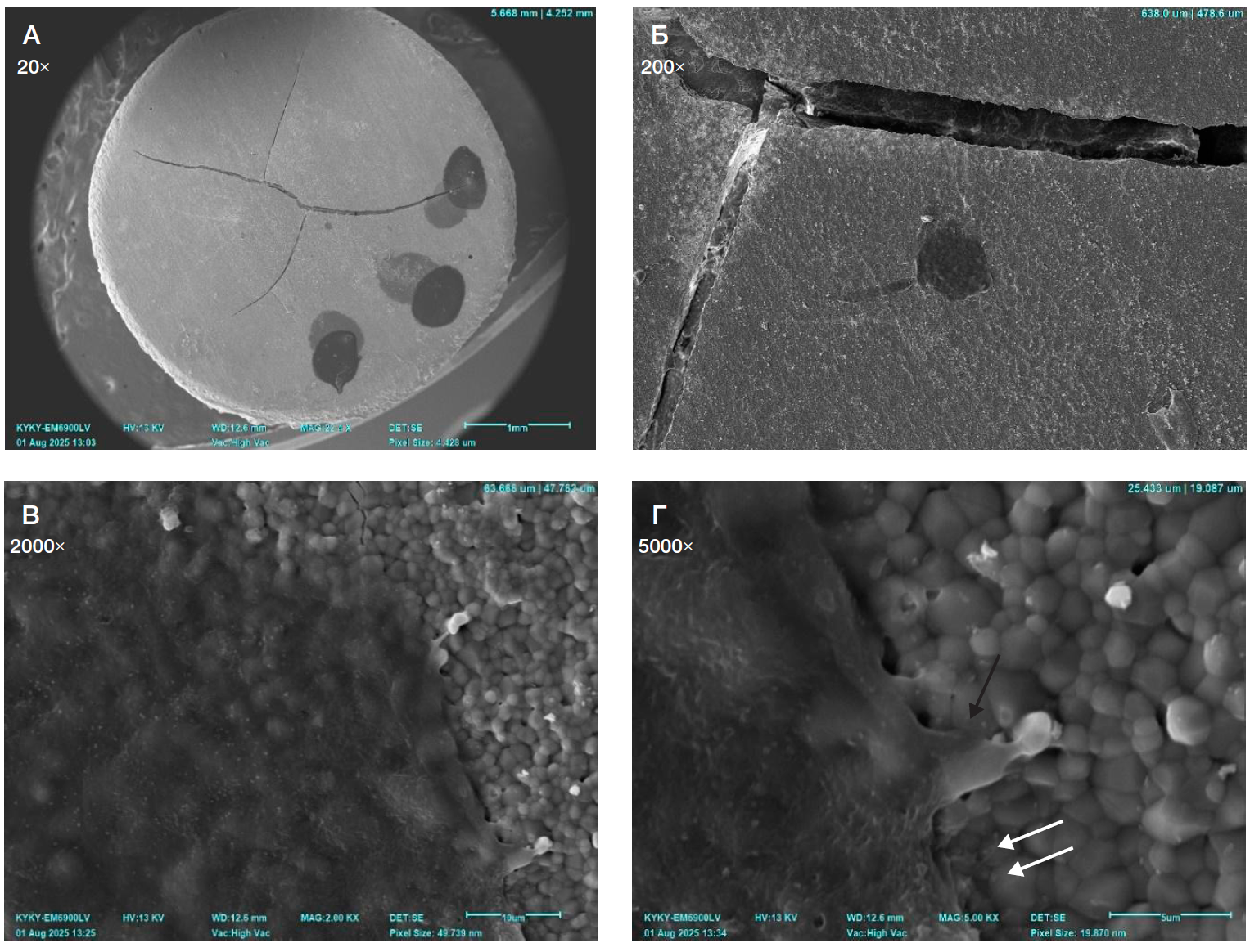 Рис. 1. Сканограммы поверхности образцов трикальцийфосфата после спекания при 800 °С с растущими мезенхимальными стволовыми клетками из жировой ткани, 7 суток культивирования. Черной стрелкой показаны темные клетки на поверхности цилиндрического образца трикальцийфосфата, белой стрелкой — тонкие выросты мембраны. Клетки крупные, образуют скопление, сильно распластаны, контактируют между собой широкими выростами, поверхность клеток ровная, гладкая, просматриваются тонкие выросты мембраны под телом клетки и по периферии. Увеличение от 20× до 10 000×
