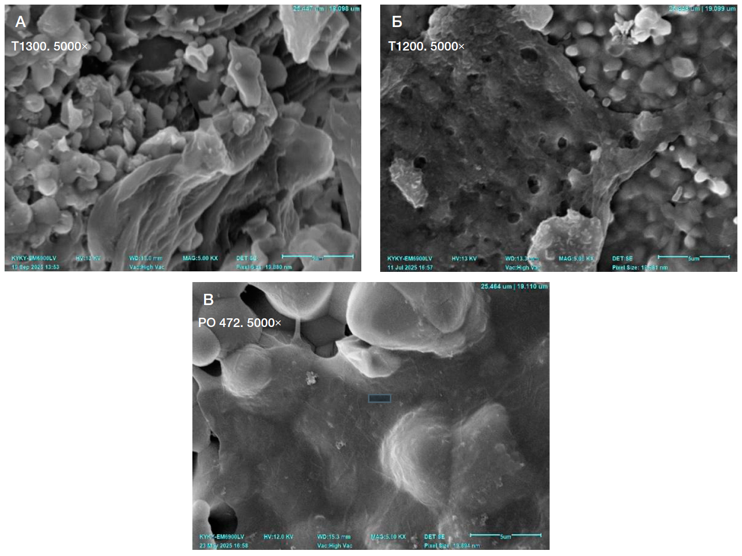 Рис. 5. Морфологические особенности мезенхимальных стволовых клеток из жировой ткани на поверхности образцов из трикальцийфосфата. Сканограммы. А. Складчатая поверхность клетки, гладкая, низкая степень распластанности, адгезия в отдельных точках, отсутствуют выросты тела клетки. Б. Клетка распластана, практически полностью адгезирована, поверхность бугристая, наблюдаются широкие и отдельные тонкие выросты в небольшом количестве по периферии. В. Клетка сильно распластана, полностью адгезирована, поверхность ровная, наблюдаются широкие и тонкие выросты в большом количестве под телом клетки и по периферии. Т1200, Т1300 — температура спекания материала при изготовлении образцов в °С. РО 472 — маркировка лабораторного образца