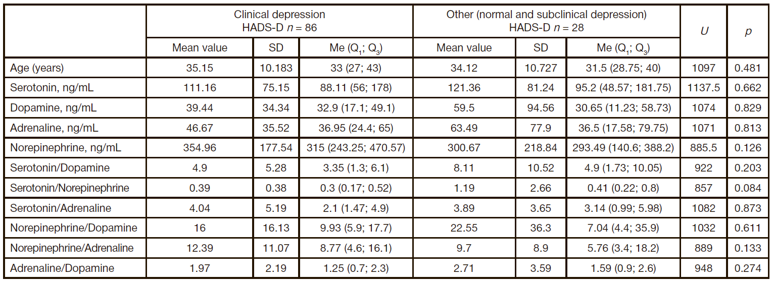 Table 4. Comparison of patients with the clinical diagnoses of depression and anxiety based on biochemical indicators