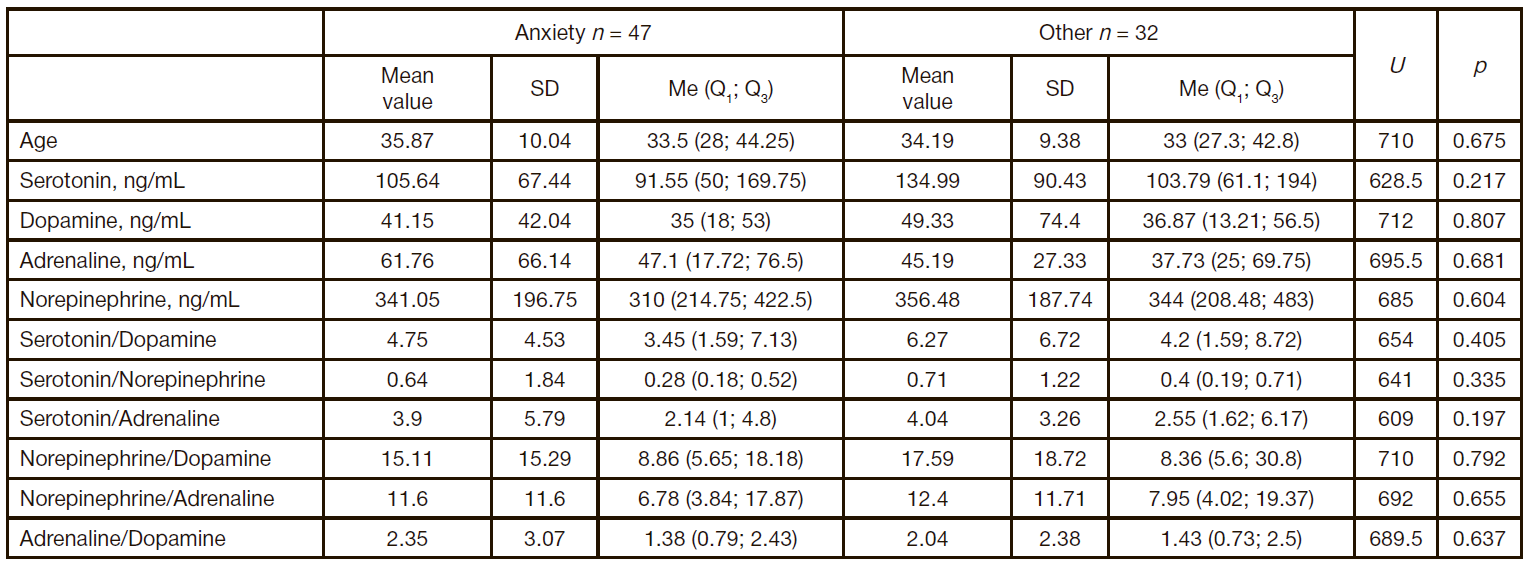 Table 5. Comparison of patients with the clinical diagnoses of anxiety and “Other” based on biochemical indicators
