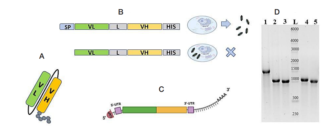 Fig. 1. Basic structure of the developed scFv antibody fragments against influenza A and B viruses and the exogenous mRNAs encoding them. A. Structure of scFvs composed of variable domains of the light (green) and heavy (orange) chains. The black line indicates the linker peptide (G4S)4. Gray circles indicate the C-terminal 6×His-tag sequence. B. Structure of the coding regions of secreted and cytosolic scFv antibodies. The key difference is the presence of a signal peptide (SP) at the N terminus in the secreted variant. VL and VH denote the variable domains of the light and heavy chains, respectively; L, the linker peptide; HIS, the 6'His tag sequence. C. Structure of the exogenous mRNA used for intracellular scFv translation. The 5' cap (m7GmAmG) is shown at the 5' terminus; the 5' UTR and 3'UTR regulatory regions are shown in lilac; green and yellow blocks represent the scFv coding region; the extended gray line with notches represents the poly(A) tail. D. Agarose gel electrophoretic analysis of purified exogenous mRNA preparations: lane 1, negative control mRNA encoding the heavy chain of an immunoglobulin against an irrelevant antigen (NC-RNA), estimated length 1792 nt; lane 2, mRNA encoding scFv-FI6-SP, 1219 nt; lane 3, mRNA encoding scFv-FI6-WO, 1162 nt; lane 4, mRNA encoding scFv-2/3-SP, 1201 nt; lane 5, mRNA encoding scFv-2/3-WO, 1138 nt. L, RNA molecular weight marker (RiboRuler High Range RNA Ladder; Thermo Fisher Scientific, USA). Marker sizes (nt) are indicated on the lane