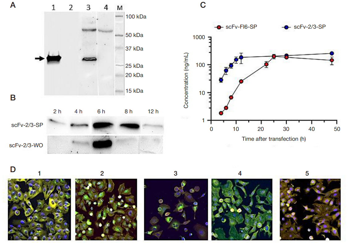 Fig. 2. Translational activity of exogenous mRNAs encoding cytosolic (WO) and secreted (SP) forms of scFv antibody fragments against influenza A and B viruses. A. Western blot analysis of scFv-2/3 antibody fragments in culture medium and MDCK cell lysates using antibodies specific to the 6'His tag sequence. Similar results were obtained for scFv-FI6 but are not shown. Lanes 1 and 2 show culture medium from MDCK cells transfected with mRNAs encoding scFv-2/3-SP and scFv-2/3WO, respectively; lanes 3 and 4 show cell lysates from MDCK cells transfected with mRNAs encoding scFv-2/3-SP and scFv-2/3-WO, respectively. M, molecular weight marker (Precision Plus Protein Kaleidoscope Preferred Protein Standards; Bio-Rad, USA); corresponding molecular weights (kDa) are indicated to the right. All samples were collected 24 h after mRNA cell transfection. B. Western blot analysis of scFv-2/3 antibody fragments in MDCK cell lysates at different time points using anti–6'His-tag antibodies. The upper panel shows intracellular production of scFv-2/3-SP, and the lower panel shows scFv-2/3-WO. Sampling times after mRNA transfection are indicated at the top (hours). C. ELISA analysis of scFv concentrations in culture medium after transfection of A549 cells with mRNAs encoding scFvFI6-SP (red) and scFv-2/3-SP (blue). Data points represent mean values from two biological replicates ± SD. D. Representative fluorescence microscopy images of fixed A549 cells transfected with exogenous mRNAs encoding: (1) scFv-FI6-SP, (2) scFv-FI6-WO, (3) scFv-2/3-SP, (4) scFv-2/3-WO, and (5) NC-RNA. The actin cytoskeleton (yellow) was visualized using rhodamine-conjugated phalloidin, and nuclei (blue) were stained with DAPI. scFv fragments (green) were detected using primary mouse monoclonal anti-6'His-tag antibodies followed by Alexa Fluor 488-conjugated goat anti-mouse secondary antibodies. Images were acquired and processed using a Cytell cell imaging system (40× objective); individual channels were pseudocolored in RGB during image processing. Enlarged views of the processed images are shown