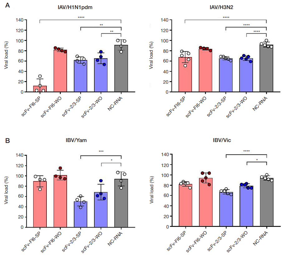 Fig. 3. In-cell ELISA analysis of the antiviral activity of exogenous mRNAs encoding cytosolic (WO) and secreted (SP) forms of scFv antibody fragments against influenza A and B viruses. A. Intracellular levels of influenza A virus (IAV) after infection with A/California/07/09 (H1N1pdm) (left) and A/Cambodia/e0826360/2020 (H3N2) (right) strains. B. Intracellular levels of influenza B virus (IBV) after infection with B/Phuket/3073/13 (Yamagata) (left) and B/Malaysia/2506/2004 (Victoria) (right) strains. Data points represent mean values for four samples ± SD. Red bars indicate therapeutic administration of exogenous mRNAs encoding scFv fragments against IAV hemagglutinin; blue bars indicate administration of exogenous mRNAs encoding scFv fragments against IBV nucleoprotein. Gray bars show mean values for cells transfected with exogenous mRNA encoding the heavy chain of an immunoglobulin specific to an irrelevant antigen (negative control). Statistical significance was determined using one-way ANOVA followed by Holm-Šídák multiple comparison test. Asterisks indicate significant differences compared with the negative control (NC-RNA): * — pvalue < 0.0332; * * — pvalue < 0.0021; * * * — pvalue < 0.0002; * * * * — pvalue < 0.0001