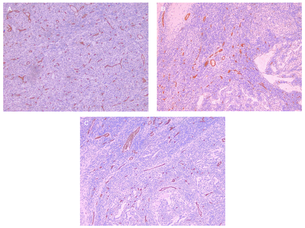 Fig. 1. A. Intratumoral zone (CD31, ×200). A dense network of thin-walled capillaries with branching and looping contours, peculiar to the hotspots of angiogenesis. B. Peritumoral zone (CD31, ×200). An ordered vascular network of lower density, vessels oriented along the collagen bundles. C. Peritumoral zone (CD31, ×200). Mosaic microvascular proliferation composed of small and medium vessels, reflecting the spatial heterogeneity of angiogenesis