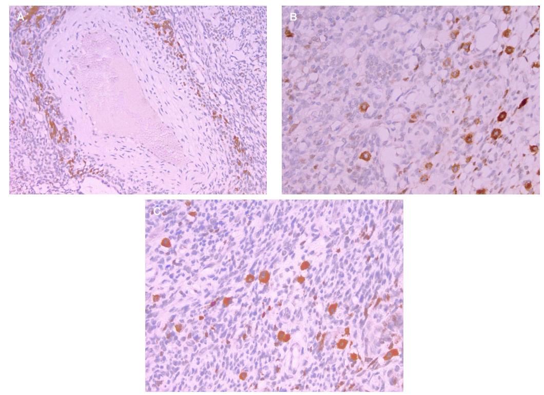 Fig. 3. A. Perivascular zone ≤ 50 µm (CD117, ×200). Clustering of mast cells along the vascular wall; individual cells with extracellular granules (an indirect sign of degranulation). B. Perivascular zone ≤ 50 µm (CD117, ×400). Clusters of mature granular mast cells forming vascular cuffing. C. Intratumoral zone (CD117, ×400). Solitary mast cells lacking pronounced perivascular orientation, with partial loss of granularity