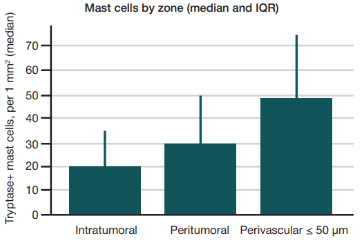 Fig. 4. The density of tryptase+ mast cells in the intratumoral, peritumoral, and perivascular (≤ 50 µm from CD31+/CD34+ vessels) zones