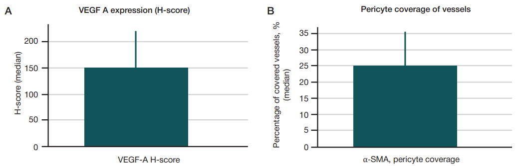 Fig. 5. А. VEGF-A expression (H-score) in synovial saracoma tissues. B. Pericyte coverage of vessels, α-SMA.