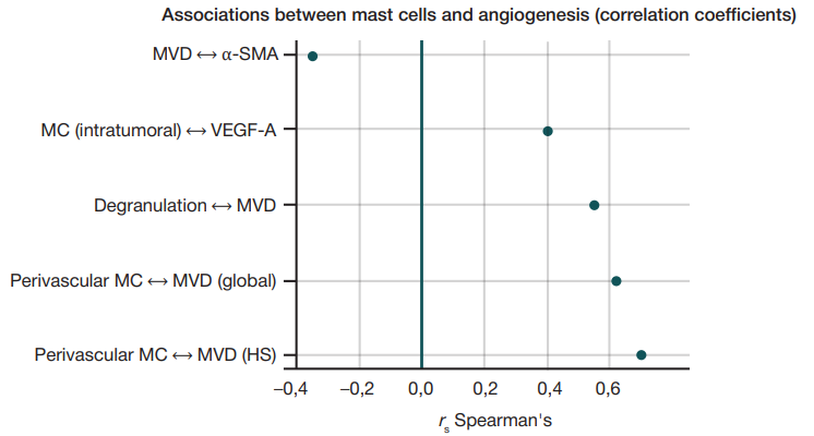 Fig. 6. Correlations between mast cell density, MVD, VEGF-A and α-SMA pericyte coverage (Spearman's coefficients)