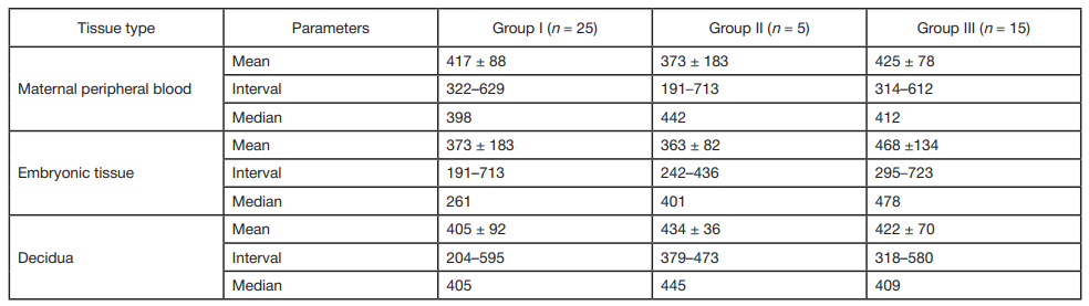 Note: the data are presented as the median (min–max); descriptive statistics for quantitative variables are presented as the mean and standard deviation — M (SD); sample C — blood from the patient’s cubital vein; sample E — embryonic tissue; sample D — decidual tissue.