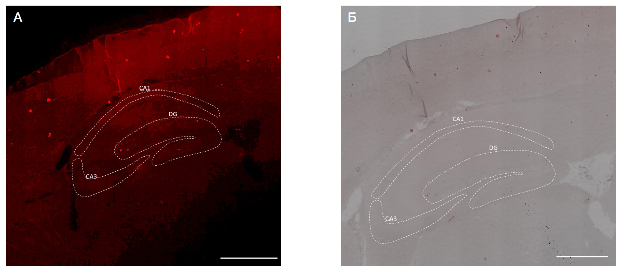 Рис. Конгофильные амилоидные бляшки на типичном срезе головного мозга интактной трансгенной мыши линии APP/PS1 в возрасте пять месяцев. А. Флуоресцентный сигнал после окрашивания красителем Конго красный. Б. Совмещенное изображение при флуоресценции Конго красного и в проходящем свете. Пунктирной линией обозначены зоны CA1, CA3 и DG (зубчатая извилина). Шкала — 500 мкм