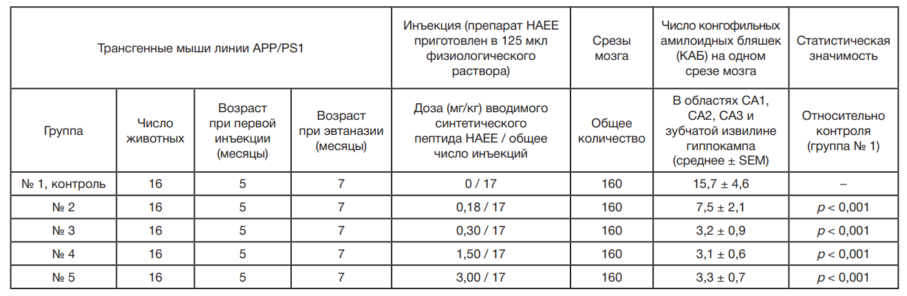Таблица. Подавление образования конгофильных амилоидных бляшек в областях СА1, СА2, СА3 и зубчатой извилине гиппокампа трансгенных мышей линии APP/PS1 под действием многократных подкожных инъекций препаратов синтетического пептида Ac-His-Ala-Glu-Glu-NH2 (HAEE), приготовленных в 125 мкл физиологического раствора и различающихся дозой вводимого пептида