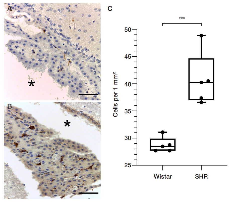Fig. 1. CD206 in the choroid plexus of the brain of Wistar rats (А), SHR (B). Immunohistochemical staining of CD206 with hematoxylin staining of nuclei. The lateral ventricular cavity is marked by an asterisk. C. Difference between CD206+ counts in rats of different lineages, р-value < 0.01. The line inside the box plot represents the median (Ме). The scale bar is 50 µm