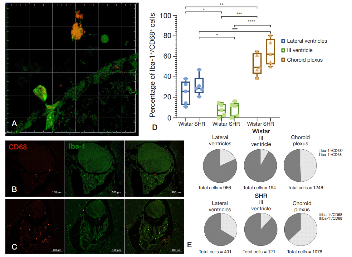 Fig. 2. Quantitative analysis results. Double immunohistochemical CD68 (red channel) and Iba-1 (green channel) stain. А–C. Overall view of subependymal microglia of the lateral (А) and third (B, C) ventricles. А. Subependymal and intraventricular microglia of SHR, 3D reconstruction of a series of optic slices, measuring grid cell size 10 × 10 µm, Wistar rats (B), SHR (C). D, E. Comparison results for the percentage of the cells staining positive for two markers, box plot (D) and pie chart (E). P-value: * — < 0.05; * * — < 0.01; * * * — < 0.001. The line inside the box plot represents the median (Ме)