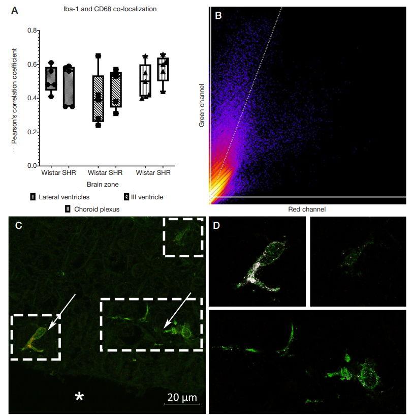 Fig. 3. Co-localization analysis results. Double immunohistochemical Iba-1 (green channel) and CD68 (red channel) stain. А. Pearson’s correlation coefficients in various brain areas of Wistar rats and SHR. B. Correlation diagram of two channels. C. Microglia of the third ventricular floor. D. Co-localization of Iba-1 and CD68. Sites of marker co-localization are highlighted in white in Fig. D. Arrows point at microglia, frames show the areas presented in Fig. D, the ventricular cavity is marked by an asterisk. The line inside the box plot represents the median (Ме)